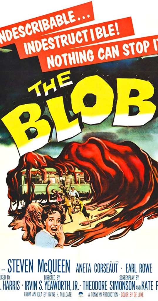 Made in 1958, The Blob starts with Jane and Steve, played by Aneta Corseaut and Steve McQueen in his first starring role, as they make out in his car just outside of town. Suddenly an asteroid lands not far from them. An old man finds the asteroid and prods it with a stick. Just then, the thing latches onto his hand. and begins to consume him. Jane and Steve take him to the doctor. Not the hospital, the doctor who works out of his home, a simpler time. The thing soon consumes the old man and everyone else in its path. It grows to gargantuan proportions as the more it eats, the bigger it gets.